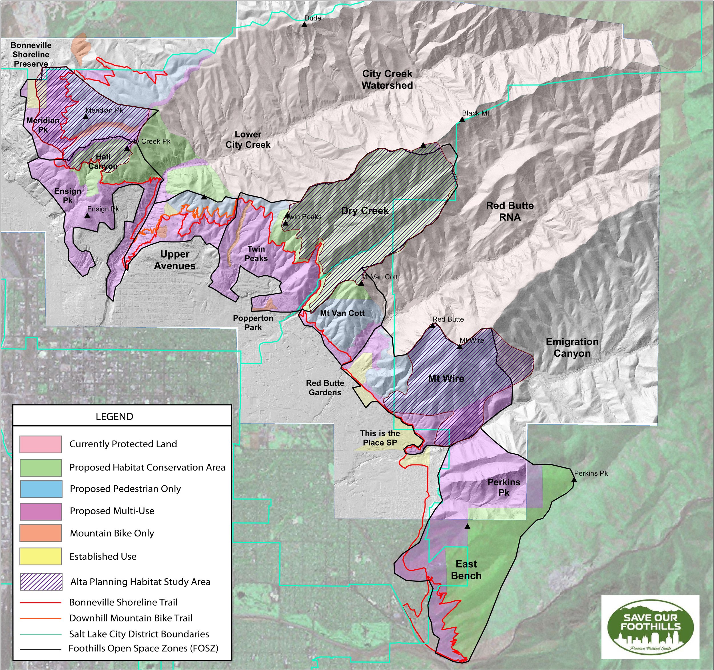Figure 3. Proposed Land Use and Recreation Management Map for the Salt Lake City Foothills showing “Habitat Study Areas” defined by Alta Planning and Design as part of the 2020 Salt Lake City Foothills Trail Plan. Note the overlap between the “Habitat Study Areas” defined by Alta Planning and Design, and the “Proposed Habitat Conservation” and “Proposed Pedestrian Only” areas identified by Save Our Foothills.