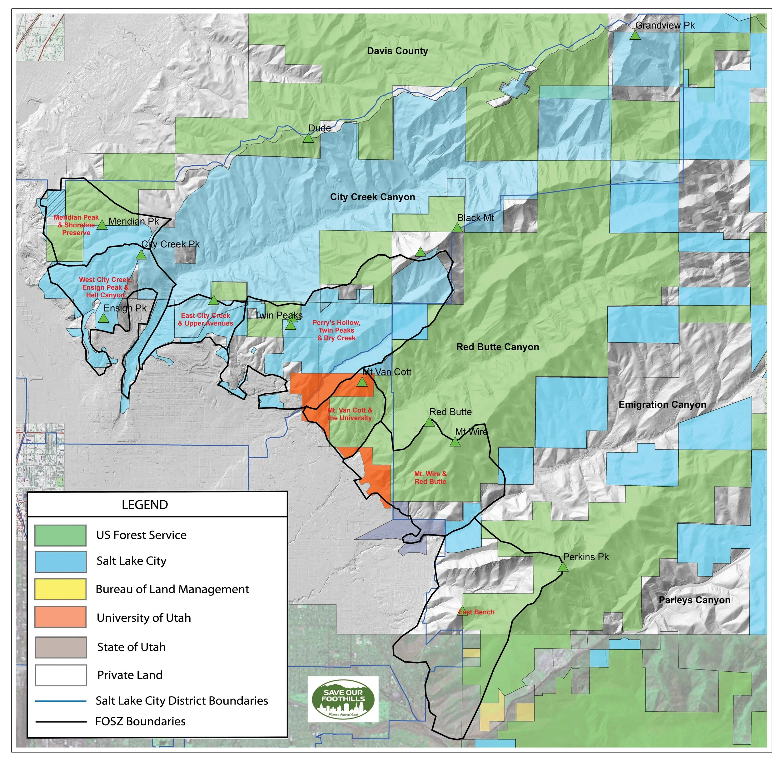 Figure 5. Land Ownership Map for the Salt Lake City Foothills with Foothill Open Space Zones (FOSZ)