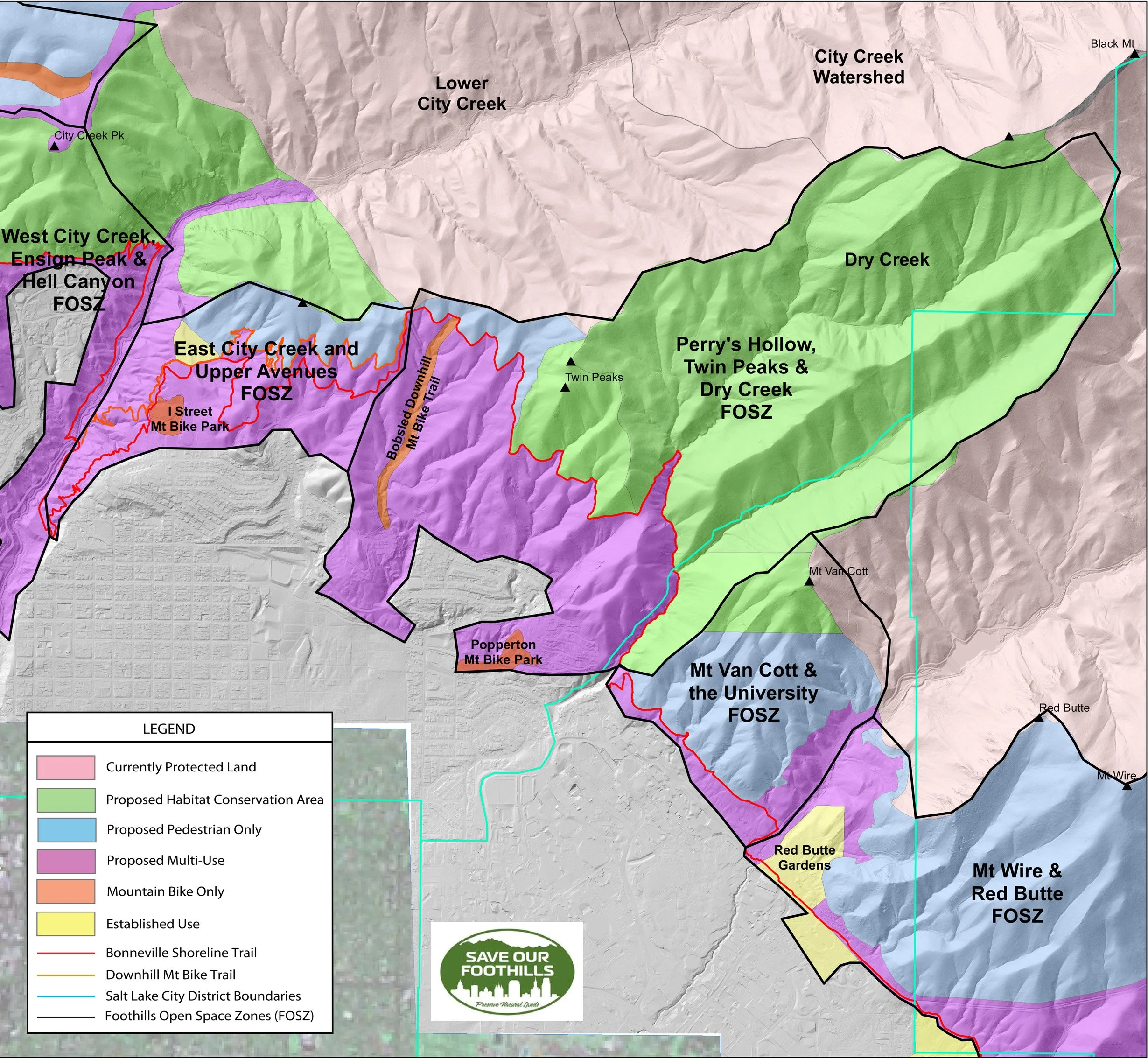 Figure 2. Detail of Proposed Land Use and Recreation Management Map for the Salt Lake City Foothills showing the East City Creek & Upper Avenues FOSZ, and the Perry’s Hollow, Twin Peaks & Dry Creek FOSZ.